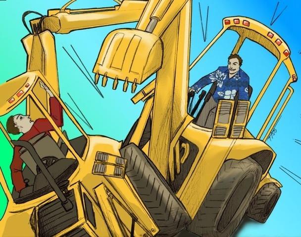 Gideon Crew and his nemesis engaged in a 'swordfight' with backhoes, from Gideon's Sword.